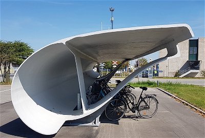 One immediate solution is to slice up the blades and turn them into bike racks. This one in Denmark protects bicycles from the wind and rain. Other projects in development include footbridges, skate parks, and roofs for bus stops and “glamping pods.”