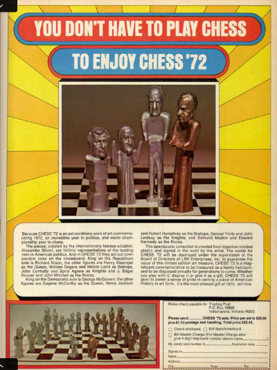 This set is, I gather, different from the Watergatechess sets available on online auctions, as it shows the final stage of Nixon’s presidency.