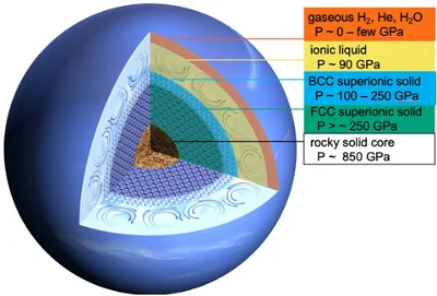 On earth, water is liquid at temperatures humans operate in. It solidifies into ice only at 0°C (32°F) and becomes steam at 100°C (212°F). A few years ago, scientists recreated another form of water, superionic ice or Ice XVIII, that is both liquid and solid at the same time. This happens when the oxygen atoms crystallize, but the hydrogen atoms are free to flow between them.