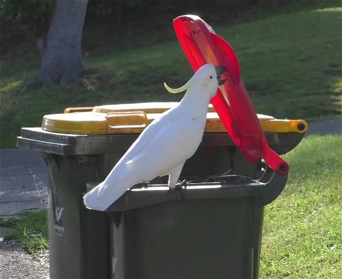 Suphur-crested cockatoos in Australia are known to scavenge food from trash bins. Recently, animal behavior researchers discovered that the techniques that the cockatoos use to lift the lids of the trash bins are actually learned behavior that spread through social learning.In late 2018, the researchers noted that a cockatoo in northern Sydney invented a distinct way to lift open the lid of the garbage bin, and that behavior was copied by birds in neighboring districts."We observed that the birds do not open the garbage bins in the same way, but rather used different opening techniques in different suburbs, suggesting that the behavior is learned by observing others," said Barbara Klump of Max Planck Institute of Animal Behavior.Image: MPI of Animal Behavior / B. Klump