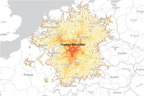 Twitter user Benjamin TD, a software engineer and mapmaker, created an application that shows users what areas of Western and Central Europe are accessible from within 5 hours of a given train station. Countries that have spent a lot on high speed rail, such as France and Germany, have enormous coverage. For example, as you can see, almost all of Germany is accessible within 5 hours of Frankfurt.